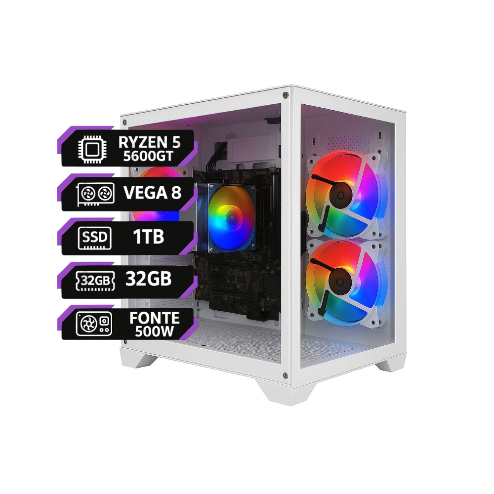 O PC Gamer Ryzen 5 5600GT White Edition entrega o máximo desempenho para quem busca performance e design.